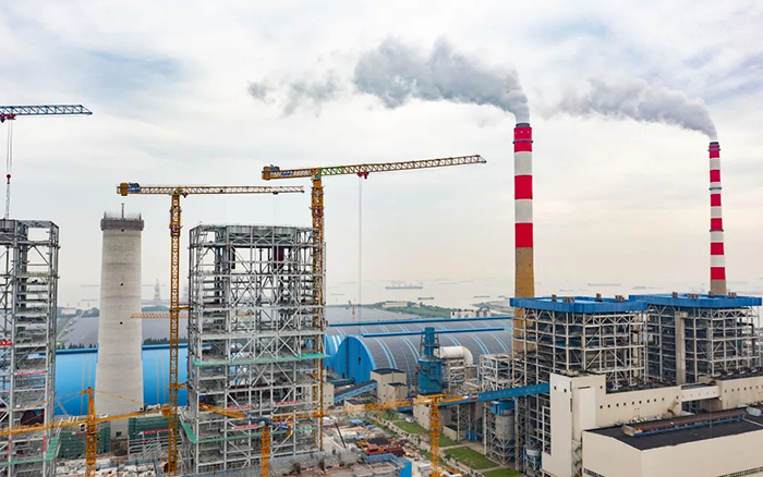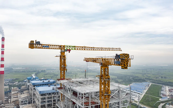 侧望长江畔,,,,机械轰鸣、江水潺潺,,,,华能太仓电厂机组扩建项目施工现场一派忙碌情形,,,,XGT3100-160S、XGT1350-64S两台尊龙凯时超大塔稳稳耸立在高耸的钢架间吊装作业。。。