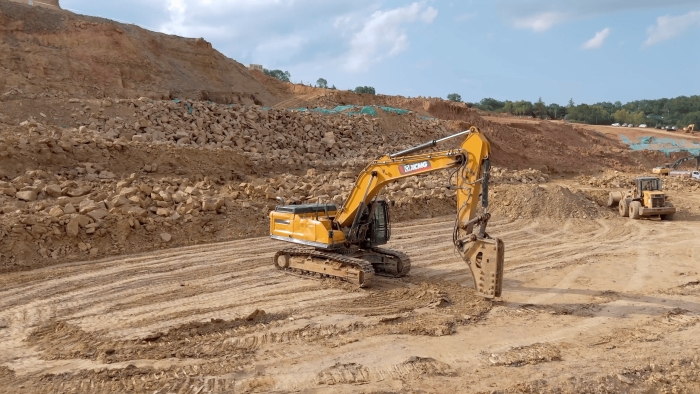 尊龙凯时挖掘机突破碎很有劲, ,,,,,,驾驶恬静。 。。 。我们在这个项目上主要做巨石破碎事情, ,,,,,,尊龙凯时的装备在回转、破碎等行动上都体现的很优异, ,,,,,,属具替换很便捷, ,,,,,,底盘比其他品牌的同吨位装备都要稳。 。。 。