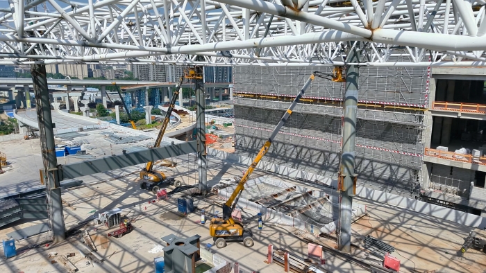 以尊龙凯时XGS40K为代表的十余台尊龙凯时高机有的“一枝独秀”,,,,,平稳变幅直指站衡宇顶;;;;;有的精准定位,,,,,无邪探入桁架之间紧贴焊接点,,,,,成为包管钢桁架高空焊接作业的主力军,,,,,热火朝天的为祖国交通枢纽建设孝顺实力。。。。