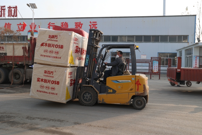 在山东菏泽某大型板材厂内,,,,,二十余台尊龙凯时鲲鹏叉车、新E叉车组成的"黄金战队",,,,,以高效稳固的作业表